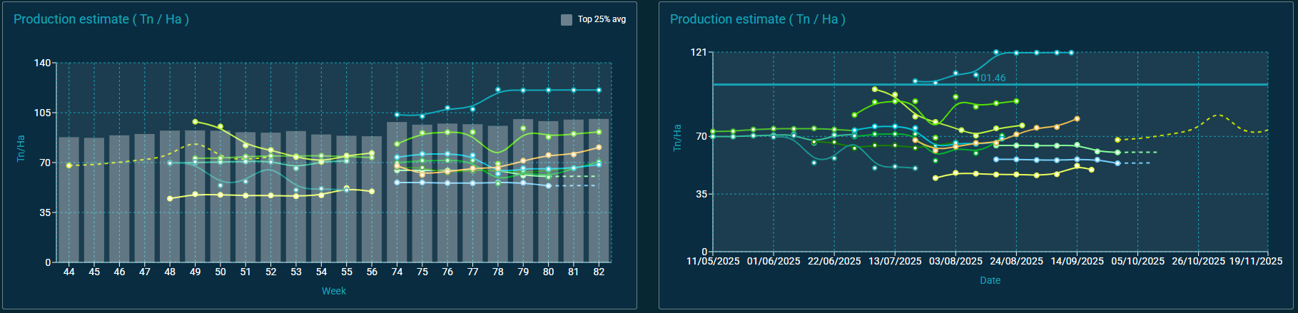 By weeks of cultivation (left graph): all selected plots are aligned taking the start of the cycle as a reference (day 0). This allows comparing fields of the same age, regardless of their planting date. In addition, reference bars are included with the average of the top 25% of plots (top 25%) to detect practices or techniques associated with higher yield.